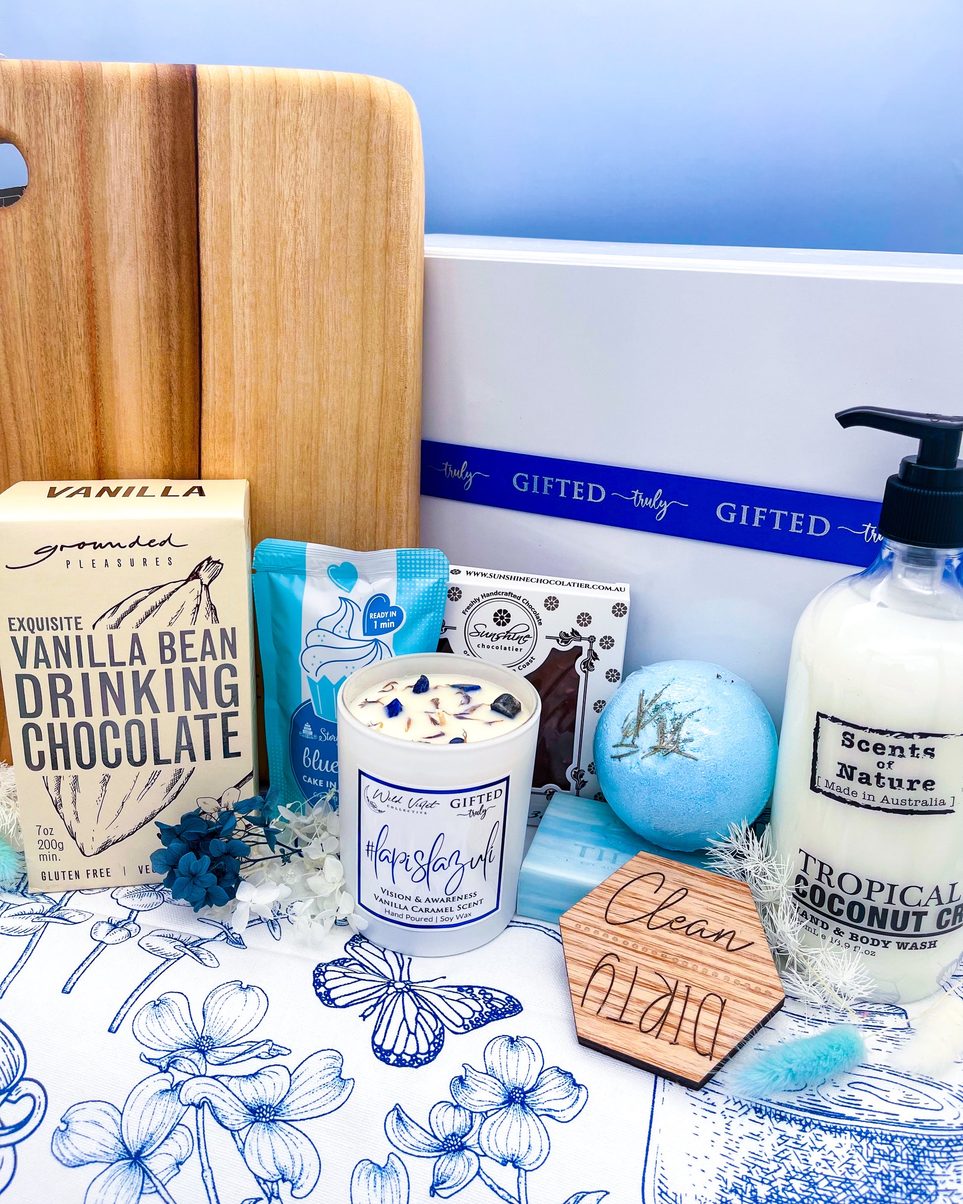 A thoughtful selection of products that acts as the perfect housewarming or real estate settlement box featuring an Australian made natural anti-bacterial cutting board along with some other choice gifts for the new home owner (or as a special treat to yourself). Presented in a reusable gift box beautifully decorated with matching colour ribbon & dried flowers.